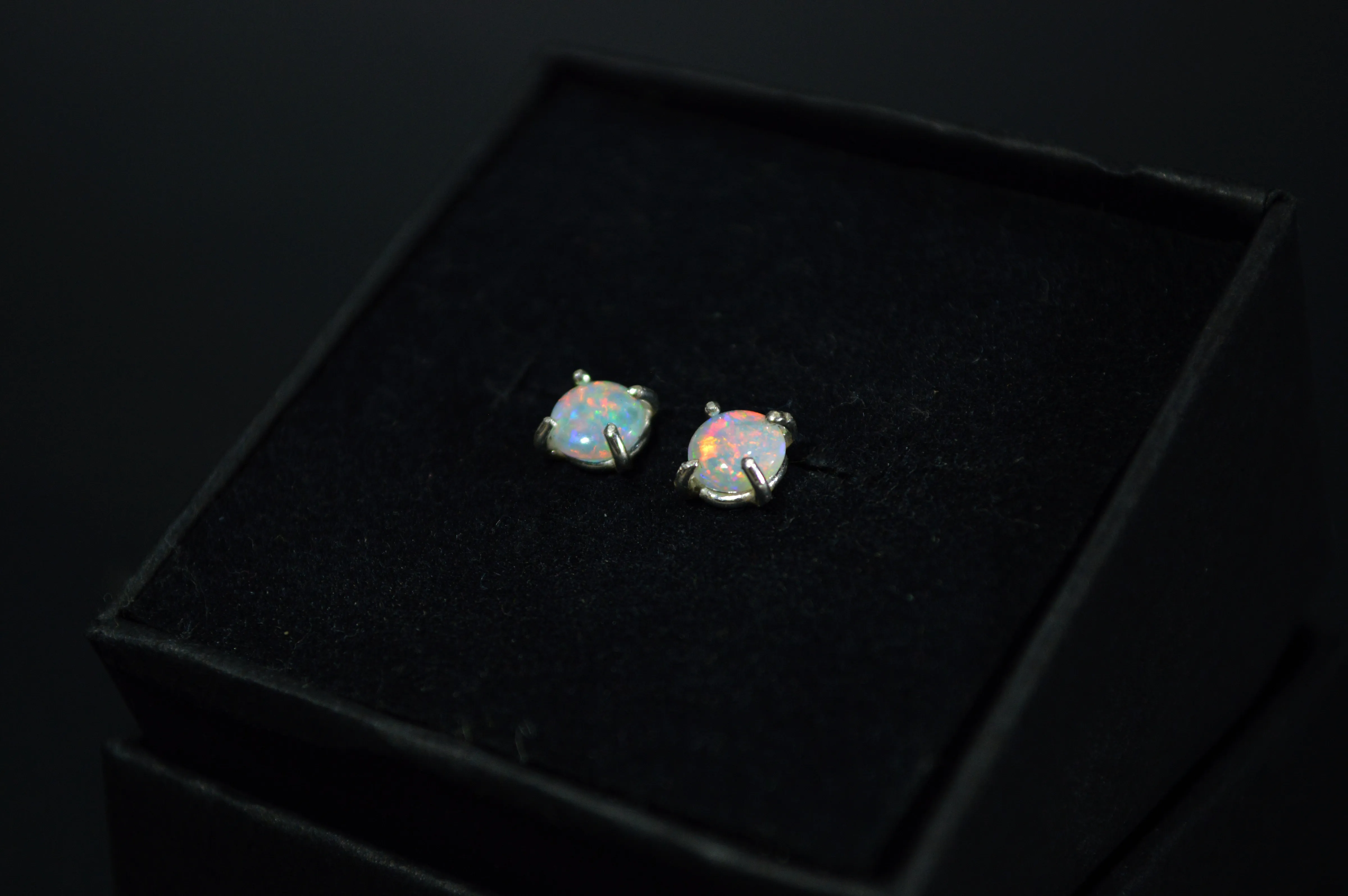 The Ancient Greeks believed opals granted the gift of prophecy and warded from disease. To the Australian Indigenous people — the opal is called the fire of the desert. World renowned for their brilliant colours, these exhilarating gemstones have many uses. These opal studs feature two genuine Coober Pedy opals set in sterling silver, also available in gold.