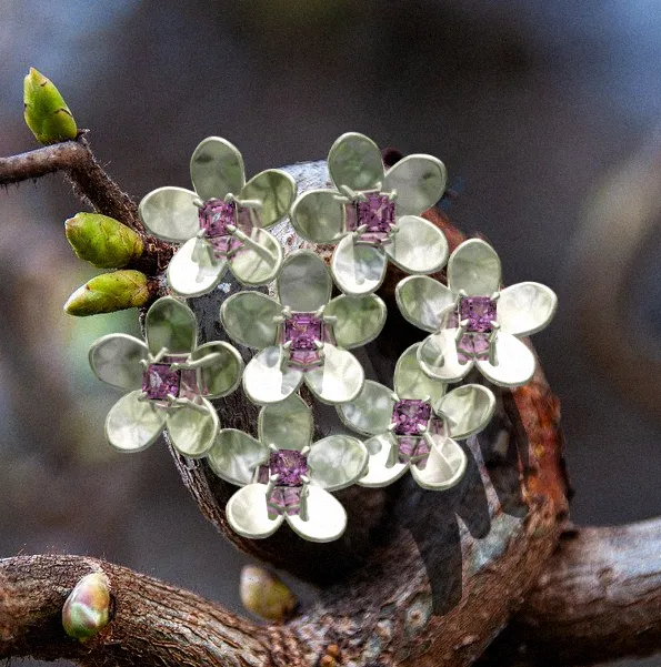 Check out the Blossoms collection. Made with 18k White Gold and 0.4 carat pink spinel.