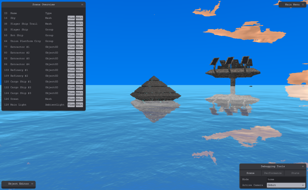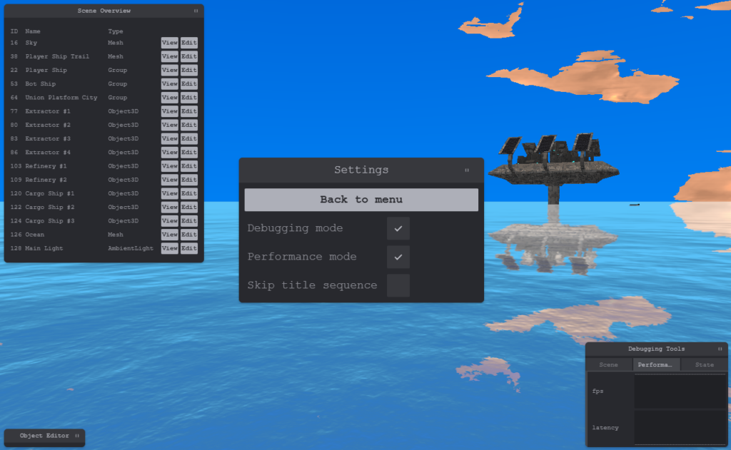 TweakPane is used to power the game’s menu system and game engine controls including the settings screen and debugging mode. The latter is used during development to test things such as frame rate, changing the active camera to look at other objects and more. This mode can be accessed by going to settings and selecting “Debugging mode”.