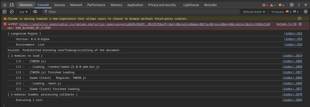 The Langenium loader is a script that was devised in v5 to allow the engine to load and unload script files dynamically. The idea was that a static version of the site had to have a way to change itself in the browser, taking on code only as needed and offloading unused code to allow for hot module replacement by using AJAX. Taking inspiration from APIs in CMSes like Drupal and WordPress, Javascript libraries can be added while declaring their dependencies and a callback. This means that a library that needs THREE.JS won’t load into memory until THREE.JS is loaded, and when both are ready a custom function within the game engine can be called to tell it things are ready to go. In the screenshot below, the final callback “l.init()” is called once its two dependencies (TWEEN.JS and the game client) are loaded.