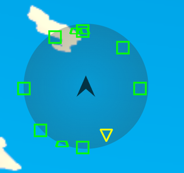 Symbols on the map determine whether a the radar system detected a structure (square), aircraft (triangle) or sea vessel (trapezoid). Green symbols represent passive targets, yellow means aggressive and red means they are currently engaged in combat with the player.