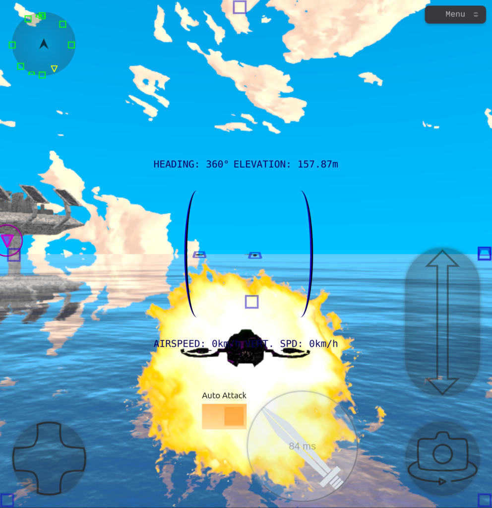 Like the aircraft’s jet engine effect, the explosions created by missiles and aircraft destruction are just a single video file rotated andy scaled randomly. A custom shader was used to make it transparent.